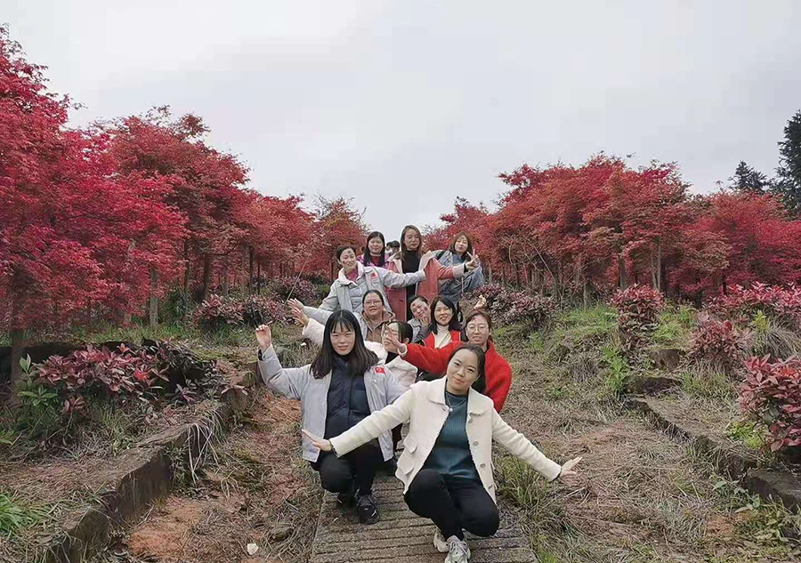 春風(fēng)得意馬蹄疾,一日看盡萬(wàn)里楓。品嘗農(nóng)家特色菜肴后,全員整裝移步紅楓林,漫步紅楓葉區(qū),與山水自然融為一體,放松心情,享受大自然溫暖,大家愜意的走在楓林小道上,環(huán)望四周楓葉搖曳處充滿著春天的氣息,遠(yuǎn)望近觀密密扎扎的樹(shù)枝上呈火焰紅,把滿山裝扮的紅彤彤的,極盡壯觀;在春陽(yáng)照耀下,微風(fēng)輕拂,楓葉左右搖曳,姹紫嫣紅,惹人陶醉,十分美麗,宛若進(jìn)入了一個(gè)童話世界里,讓大家瞬間感覺(jué)自己像是在仙氣飄渺的世外桃源中,一掃平時(shí)工作的壓力,十分放松;大家三五成群,談笑風(fēng)生,一路上聊著鬧著,畫(huà)面其樂(lè)融融,拍照留影,感受著春天的紅楓秋色。